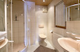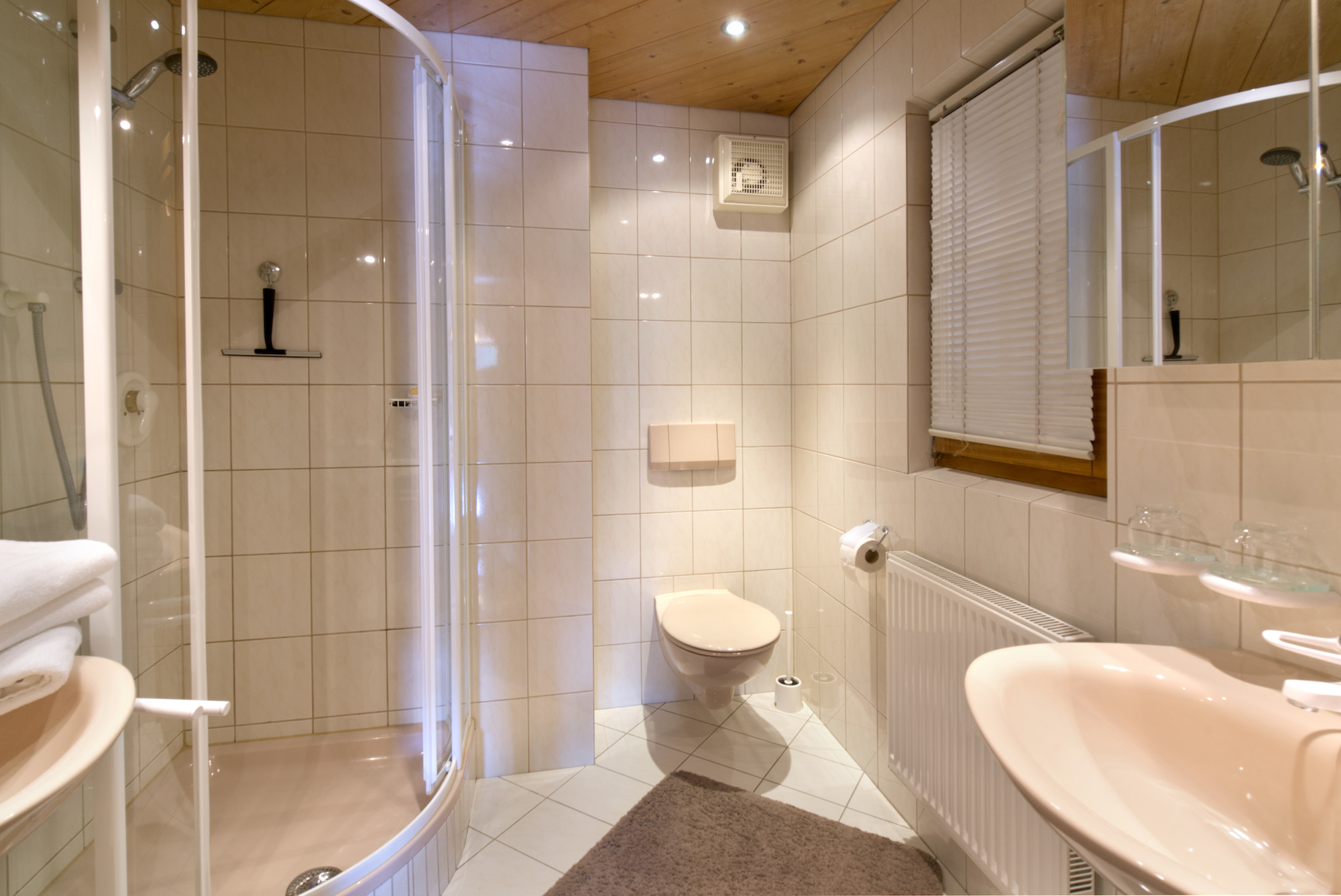 Badezimmer mit Dusche, WC, 2 Waschgelegenheiten.