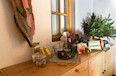 Küche mit Backofen, Kaffeemaschine, Toaster, Wasserkocher.